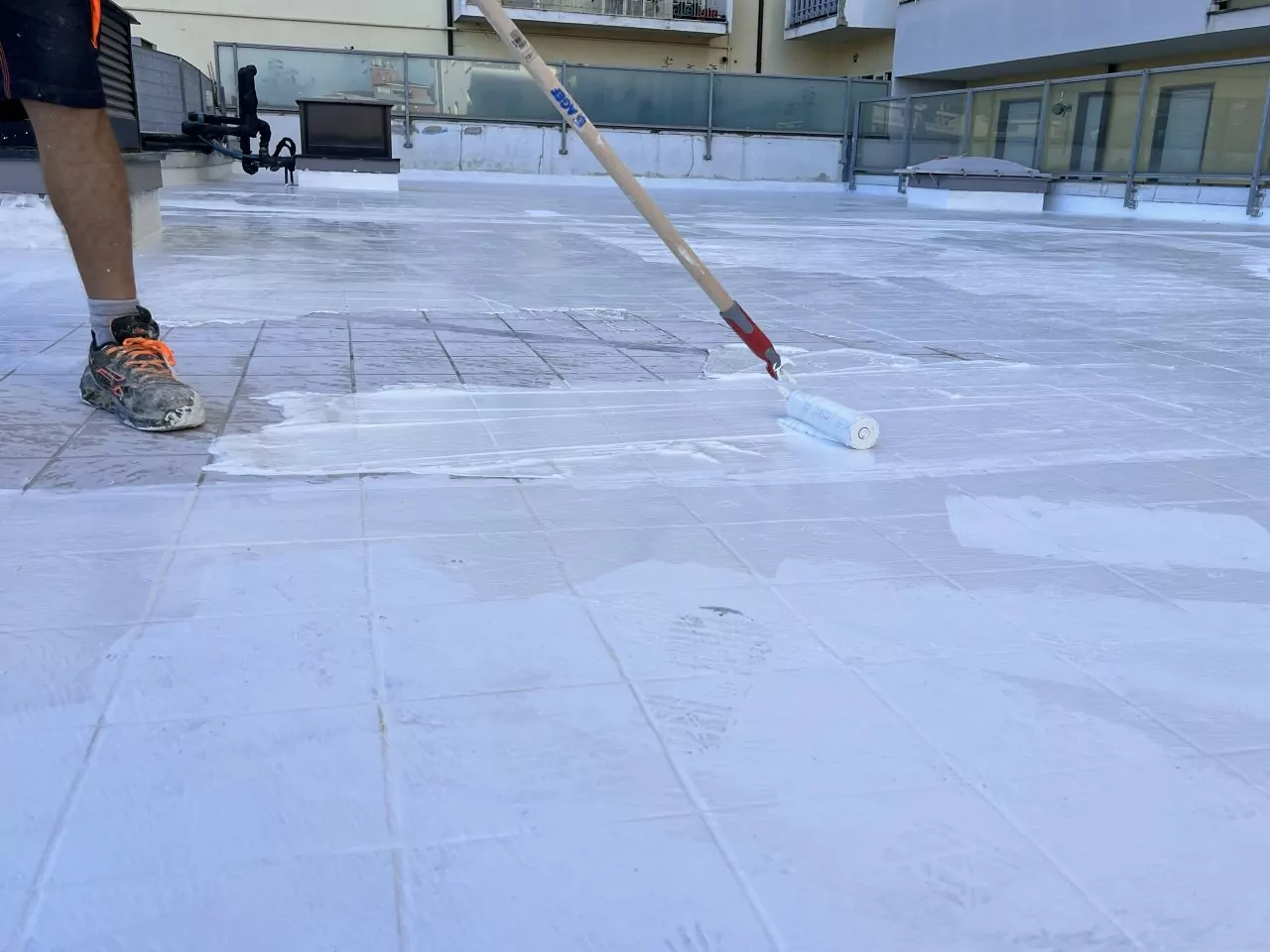 • Primjena SYNTECH PAVICAR elastičnog hidroizolacijskog sustava pomoću liječničke lopatice i nazubljene gleterice s prolaskom valjka za razbijanje mjehurića na svježem SYNTECH PAVICAR-u